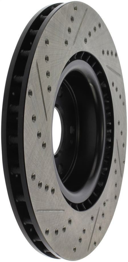 StopTech Drilled and Slotted Sport Rotors are 1-piece direct replacement brake discs for factory brake systems and stock calipers that look great behind your wheels – and offer significantly improved braking performance. The unique cross-drilling and slotting aids with heat and brake dust dispersal; prevents glazing of the pads; adds bite and improves wet and dry braking performance. Built to last; the black e-coating provides protection from corrosion and the high carbon metallurgy (in most applications) offers quieter operation; better crack resistance and increased performance.