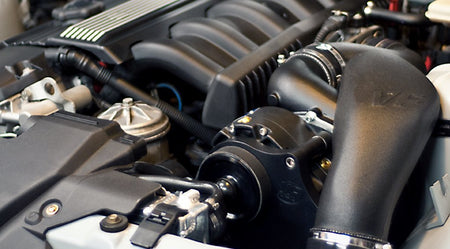 The Vortech V3 Si-Trim self contained supercharger is mounted on a CNC machined 6061-T6 aluminum bracket system triangulated to the block. The unit is positioned in line with the original serpentine belt which is replaced with a longer OEM belt. The key to this design is that the OEM active-spring belt tensioner remains fully functional and eliminates belt slip or the need to manually tension the belt. The supercharger air ducts are custom molded polypropylene plastic to give an OEM appearance, quality and fit. The incorporated Bosch boost overrun system is designed for smooth off-throttle cruising and deceleration with clean emissions. The crankcase ventilation system is designed to cope with positive pressure. High flow fuel injectors are supplied to fit as direct replacements. A removable plastic air box is provided with the K&N induction filter for those who use their vehicles in persistently wet climates. The VF supercharger system remains fully OBD2 compliant. All key components are 100% made in California.