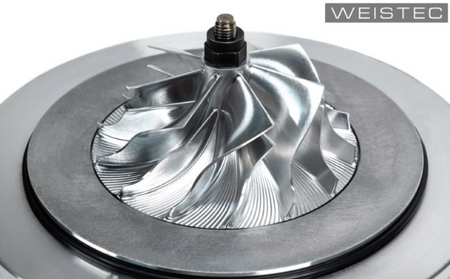 The factory turbocharger is disassembled and fully inspected. The compressor cover and center cartridge are then machined to accept Weistec's 5-axis CNC machined billet impeller wheel. Externally, no changes are made to maintain a completely stock appearance. The new impeller wheel supports greater power levels than the factory unit with little to no sacrifice in spool and response. The turbochargers are then reassembled with new seals and fully balanced for smooth operation and OEM service life. All the original oil and coolant lines bolt right up making for a simple install.