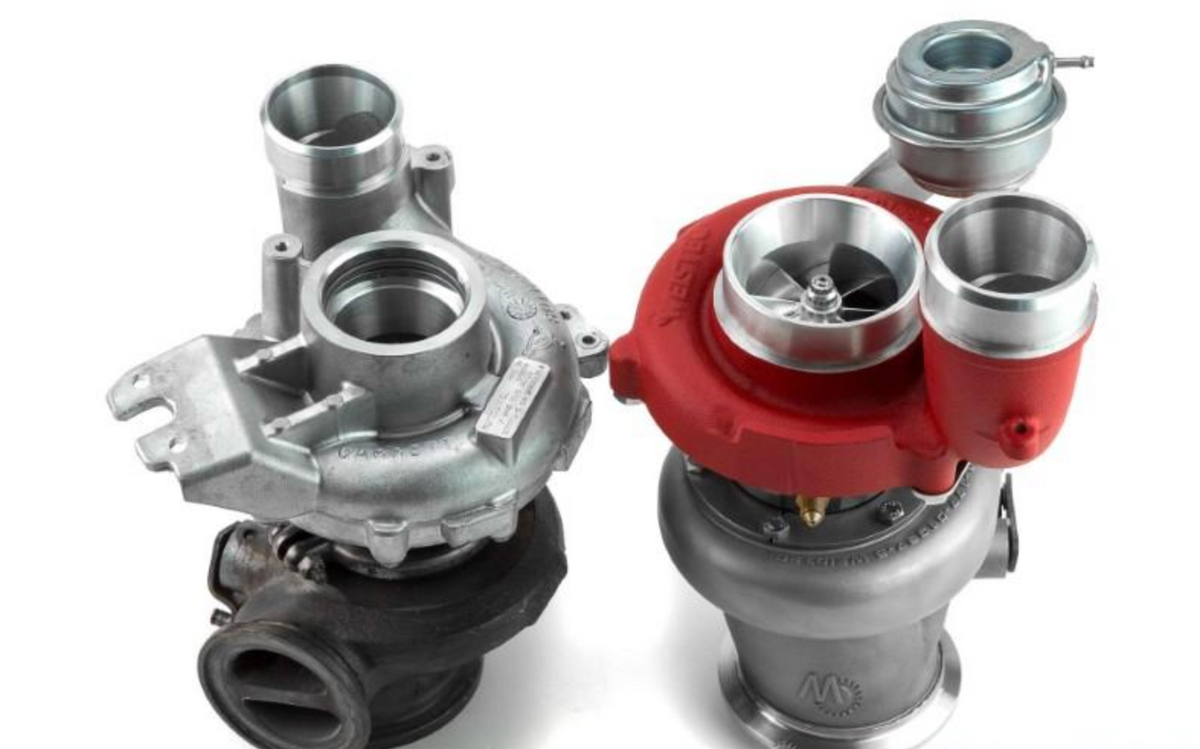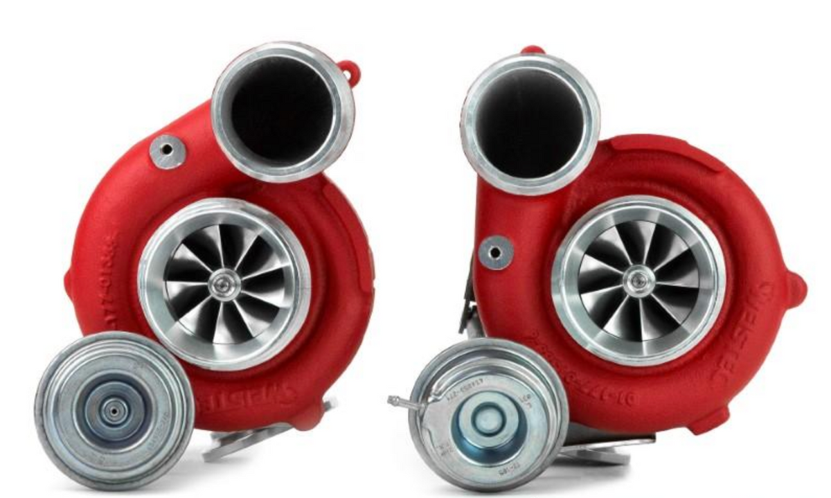 The BMW S63 W.4 Turbochargers are complete, bolt on replacements for the stock turbochargers. There are no core charges with these turbos. No need to send in your stock turbos to get modified while your car sits in pieces waiting for the turbos to get back. Simply install the Weistec W.4 Turbochargers when you receive them. All necessary hardware is included. New turbo inlet pipes that mate up to the factory airboxes (or any bolt on aftermarket intake), and new charge pipes with integrated methanol injection ports that connect the turbos to the factory intercoolers come standard with the S63 W.4 Turbochargers. A pair of Weistec 304SS downpipes are also included to connect the turbos to the rest of the exhaust without any cutting or welding as downpipes that are for the stock turbos will no longer fit the vehicle. Stainless braided oil and coolant lines are included with custom CNC machined and anodized fittings. It truely is a bolt on turbo upgrade that completely replaces the factory turbochargers. Even the factory engine cover still fits over the turbos.