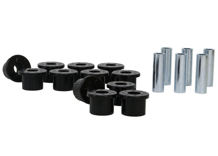All in one leaf spring bushing service kit covering front and rear eyes of the leaf plus shackle bushings. High kilometres and heavy load carrying causes excessive wear on rubber bushings. Whiteline's signature black bushings are made tough and offer outstanding abrasion resistance, high load bearing capability (4WD's, utes and towing), flexibility, increased tensile strength and chemical resistance to oil, grease, ozone and weathering.