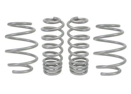 Whiteline Springs deliver improved vehicle performance whilst maintaining safety and ride quality characteristics. This kit contains 2.4kg/mm (134lb/in) front rated springs that provide a 25mm drop while the 2.0kg/mm (112lb/in) rated rears deliver a desirable 25mm to the vehicle. By lowering the vehicles centre of gravity, the unique and progressive rate coil design not only improve performance but enhance overall appearance. Developed and manufactured in Europe from the highest quality materials, coating and to the finest tolerances guaranteeing exact fitment. Whiteline Springs are engineered for optimal balance with OEM and aftermarket shocks. For total grip activation match with Whiteline Sway Bar and Essentials kit for unrivalled handling and optimal vehicle performance.