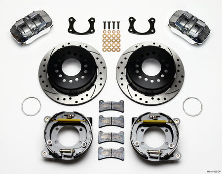 Forged Dynapro Low-Profile Pro-Series rear disc brake kits provide a complete solution for popular muscle car rear axles on applications that require a parking brake assembly and extra clearance for 14.00” to 15.00” rim applications. Forged billet Dynapro Low-Profile four-piston calipers 11.00” one-piece hat and rotor assemblies, and high friction pads provide optimized and balanced braking for all types of custom performance street/strip and show machines. The neatly hidden internal shoe system provides a clean installation with superior static holding power for parking. Optional caliper finishes and rotor designs enable the builder to personalize the style and optimize brake performance for every individual application.