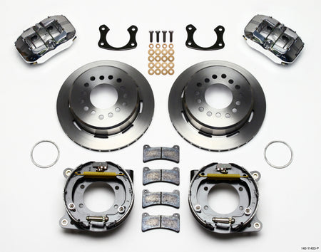 Forged Dynapro Low-Profile Pro-Series rear disc brake kits provide a complete solution for popular muscle car rear axles on applications that require a parking brake assembly and extra clearance for 14.00” to 15.00” rim applications. Forged billet Dynapro Low-Profile four-piston calipers 11.00” one-piece hat and rotor assemblies, and high friction pads provide optimized and balanced braking for all types of custom performance street/strip and show machines. The neatly hidden internal shoe system provides a clean installation with superior static holding power for parking. Optional caliper finishes and rotor designs enable the builder to personalize the style and optimize brake performance for every individual application.