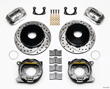 This group of FDL Pro-Series rear disc kits provides a complete solution for popular muscle car rear axles that require a parking brake. Forged billet Dynalite four piston calipers, 12.19” one-piece drum/rotors, and high friction pads provide optimized and balanced braking for all types of custom performance street/strip and show machines. The neatly hidden internal shoe system provides a clean installation with superior static holding power for parking. Optional caliper finishes and rotor designs enable the builder to personalize the style and optimize brake performance for every individual application.