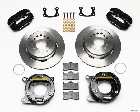 This group of FDL Pro-Series rear disc kits provides a complete solution for popular muscle car rear axles that require a parking brake. Forged billet Dynalite four piston calipers, 12.19” one-piece drum/rotors, and high friction pads provide optimized and balanced braking for all types of custom performance street/strip and show machines. The neatly hidden internal shoe system provides a clean installation with superior static holding power for parking. Optional caliper finishes and rotor designs enable the builder to personalize the style and optimize brake performance for every individual application.