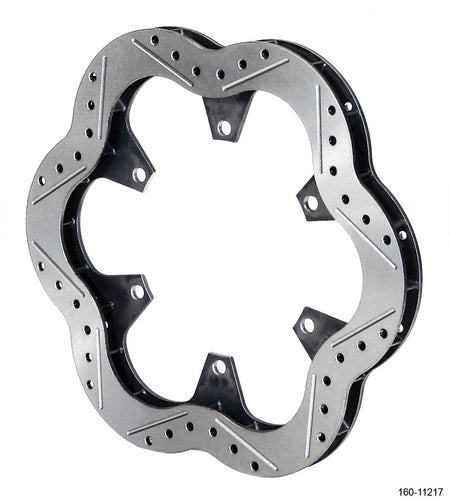 Super Alloy Steel 10.50” x .780” Vented Rotors are one of Sprint racing's lightest .750" to .810" thickness class rotor at a weight of only 3.20 pounds. Wilwood's proprietary Super Alloy Steel greatly enhances the durability and lifespan of this rotor over comparable lightweight steel or iron rotors. A Drilled, slotted, and scalloped design with 24 cooling vanes provides excellent high temperature stability, rapid heat dissipation, and consistent performance from the brake pads.